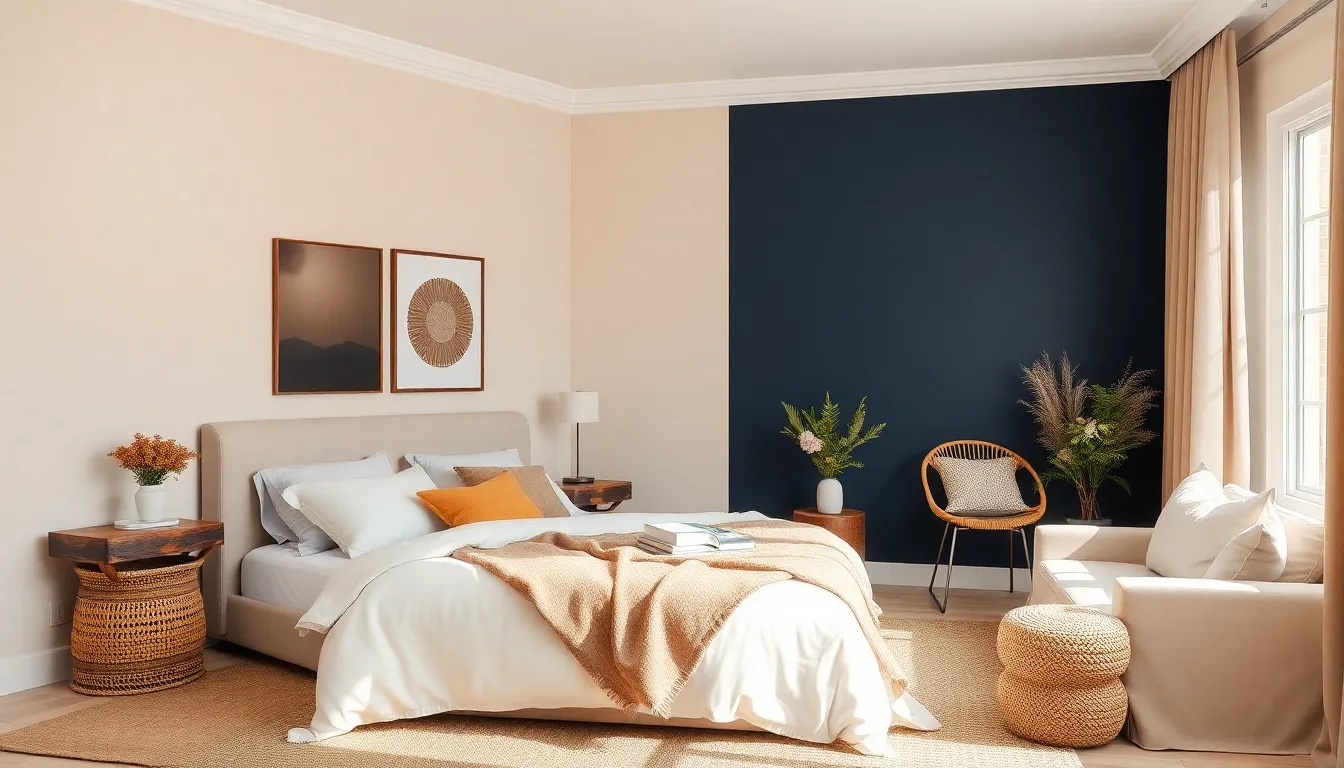 Bold accents introduce dynamic energy to a bedroom. Colors like deep navy, vibrant emerald, or rich burgundy provide striking focal points that draw attention. An accent wall in one of these shades can transform a space without overwhelming the overall design. Pairing bold colors with neutral furniture allows for a balanced aesthetic. When selecting accent colors, consider using them on smaller elements, such as decorative pillows or artwork, to ensure they stand out without dominating the room. Combining these bold accents with soft neutrals creates a harmonious yet lively space, enhancing personal style.